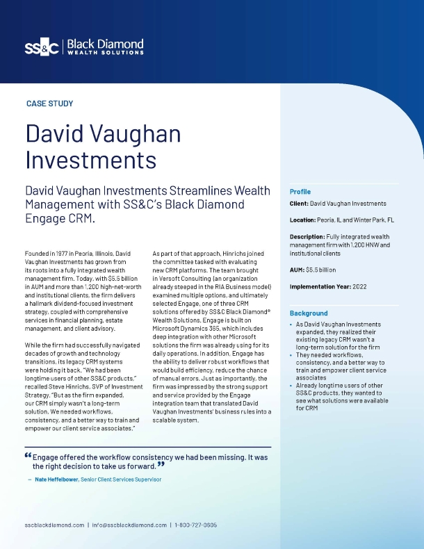 David Vaughan Investments (DVI) is a fully integrated wealth management firm with $5.5 billion in AUM and more than 1,400 high-net-worth clients. As DVI expanded, they realized their existing legacy CRM wasn’t a long-term solution for the firm. They needed workflows, consistency, and a better way to train and empower client service associates.