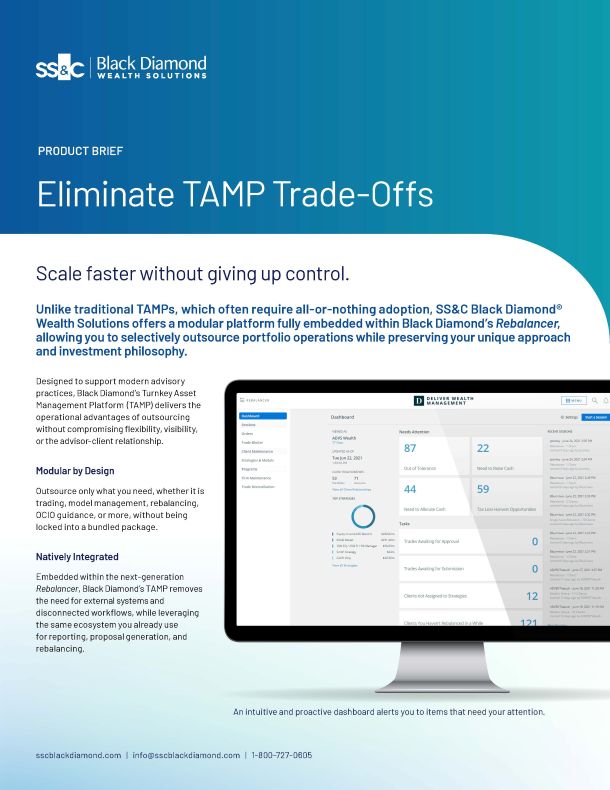 SS&C Black Diamond Wealth Solutions’ modular TAMP, embedded within Black Diamond’s Rebalancer, allows you to selectively outsource portfolio operations while maintaining full visibility and control.