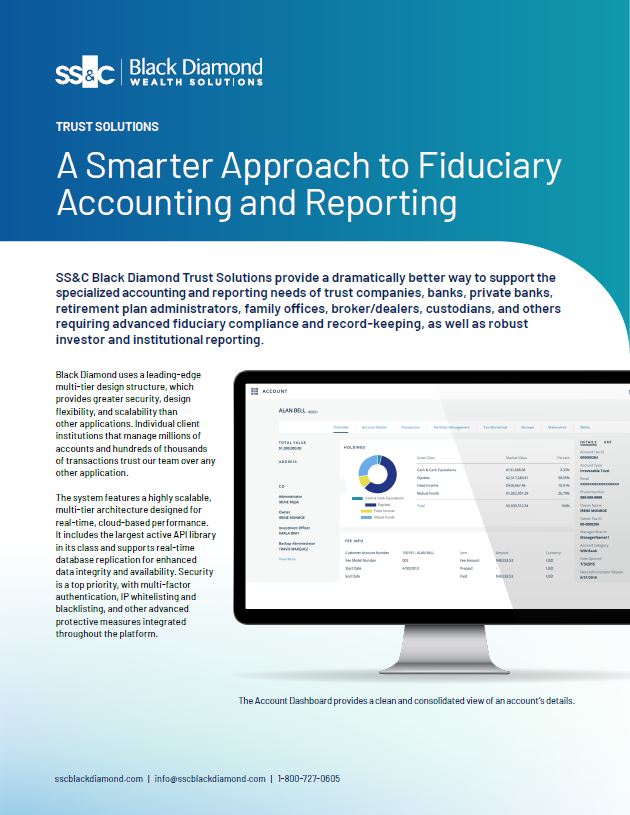 Fiduciary accounting demands precision. SS&C Black Diamond Trust Services delivers cloud‑native trust accounting, including principal & income accounting, tax processing, and performance reporting. Wrapped in configurable dashboards and enterprise‑grade security.