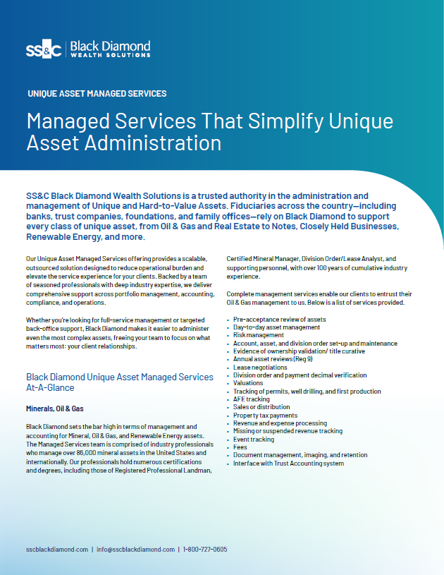 Complex, hard‑to‑value assets shouldn’t bottleneck growth. Our specialists run the day‑to‑day on minerals, oil & gas, real estate, closely held businesses, and loans. Allowing your team to focus on relationships and strategy.